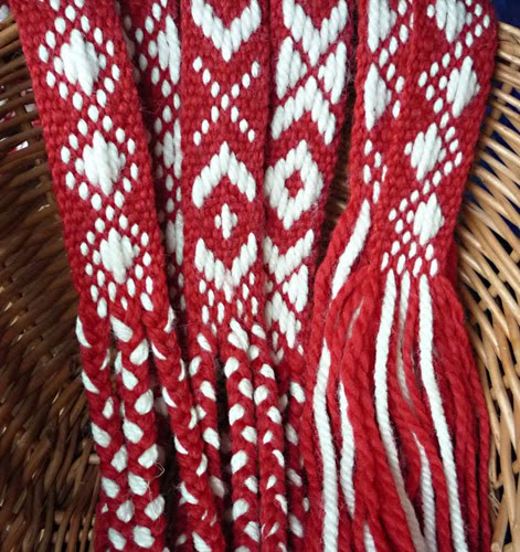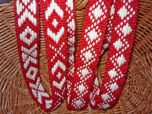 Pierwszy pas od lewej jest najkrótszy – ma 70 cm. Zakończony jest frędzlami. Możliwe, że przyda się kiedyś do przepasania jakiegoś rekonstruującego malucha 🙂