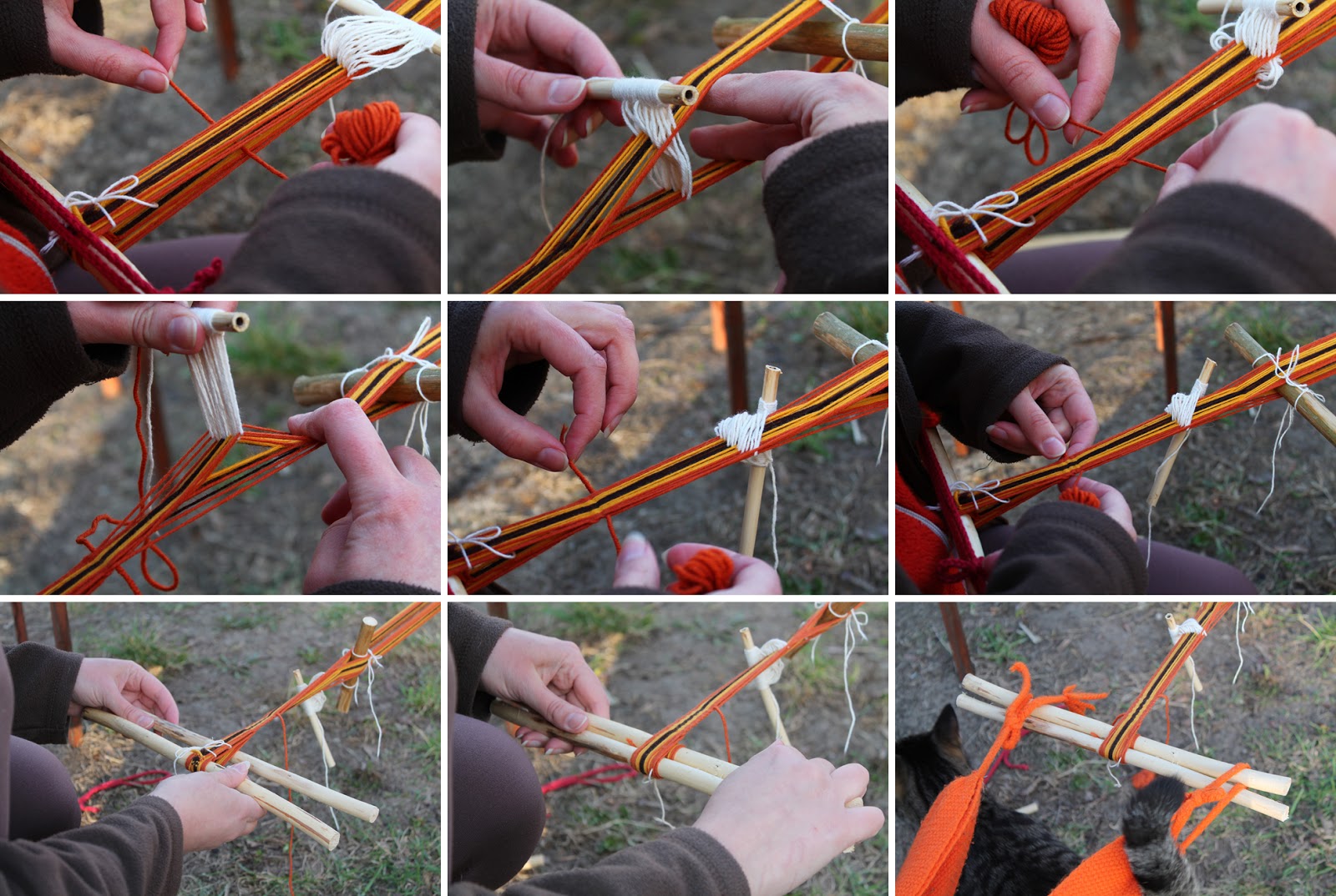 Na jednym z długich patyków trzeba zawiązać pętle z grubszych sznurków – jedna pętla poniżej nici osnowy, druga powyżej. Tymi sznurkami przymocuje się osnowę do jakiegoś stabilnego przedmiotu. Do drugiego kijka warto już teraz przymocować taśmę, którą będzie się przywiązywać do siebie.