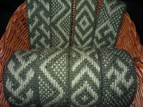 The warp is the same as in the case of brown selvedges. So this series is a bit wider than the previous green ones. Swastikas fit in elegantly. I also went a step further in the variations on the Wrocław selvedge and made something like a branch with small leaves. There is also a quite effective, although simple zigzag. And fantastic rhombuses, which I think are liked not only by me, but also by many haberdashers from different eras (a popular pattern... always).