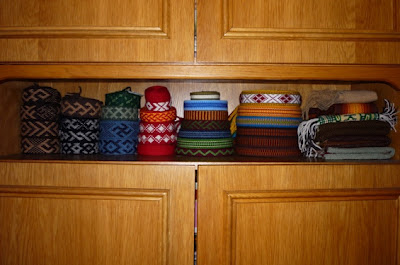 The selvedges have their place in the house – just an ordinary shelf in a wall unit. I stare at them sometimes. Now I have so many of these selvedges. Not many, because you can still see the back panel, and I would like to fill the shelf completely.