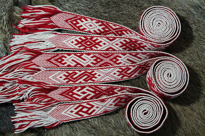 Zazwyczaj gdy już tworzę osnowę, to nie poprzestaję na małym metrażu. Tym razem miałam do dyspozycji 8 m, więc powstały 3 pasy. Jeden jest skopiowany co do kropki – kolor w oryginale zielony zastąpiony czerwonym. Długość 2,5 m, szerokość 3,7 cm. Pozostałe 2 pasy mają wzory wg mojego projektu. Na jednym są moje ulubione motywy w kształcie słońca – takie coś pojawia się na wielu tkaninach, nie tylko litewskich. Wymiary ma takie same jak pierwszy pas. Na drugim widać rodzaj swastyk – inspirowałam się znaleziskiem z St. Truiden w interpretacji Eydis&Syv. Długość 1,8 m, szerokość 3,5 cm – krótszy z mocniej zaciąganym wątkiem.
